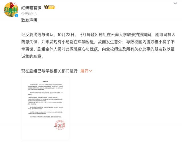 10 月 23 日凌晨,电视剧 @红舞鞋官微 发布致歉声明:10 月 22 日,《红舞鞋》剧组在云南大学取景拍摄期间,剧组司机因疏忽失误,并未发现有小动物在车辆附近,导致校园内流浪猫小橘子不幸离世。涉事司机已引咎辞职,不再继续于剧组任职。剧组将以小橘子的名字成立基金,专门用于云南大学校园内流浪动物喂养、看病、绝育等事宜。
